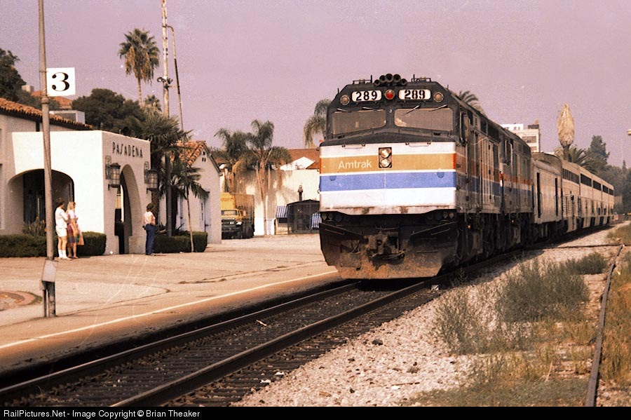 The inbound Desert Wind coasts to a stop at Pasadena Station. The number on the right side of the engine adjacent to the headlight looks like a stenciled replacement.