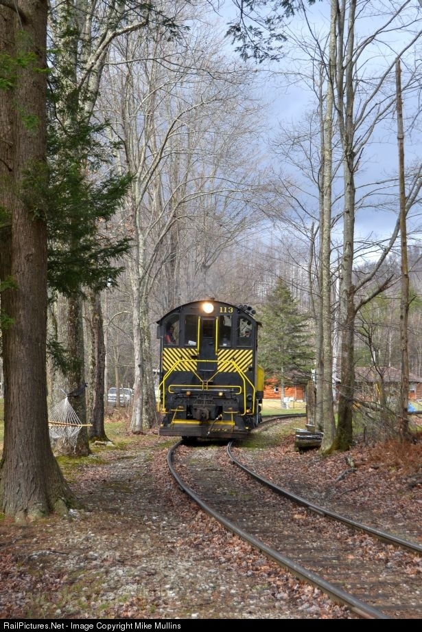 | Running light up the valley to retrieve the last cut of loads for the day, The Beech Mountain Railroad's Alco S-2 "Old 113" charges through the sleepy little community known as Palace Valley. It's not often that you see a railroad let trees grow this close to their right of way, but it does add a 'homely' touch. |