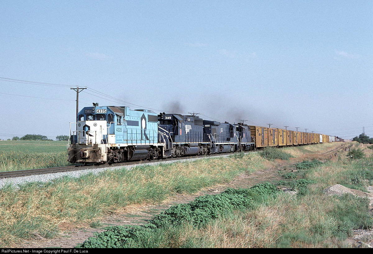 On the point of this Missouri Pacific train is a recently acquired Rock Island GP38-2 still with it's original number, even though the road name has been painted out on the carbody side. The unit will soon be renumbered MP2273. This MoPac train is seen running on the MKT about 10 miles south of Fort Worth, TX.