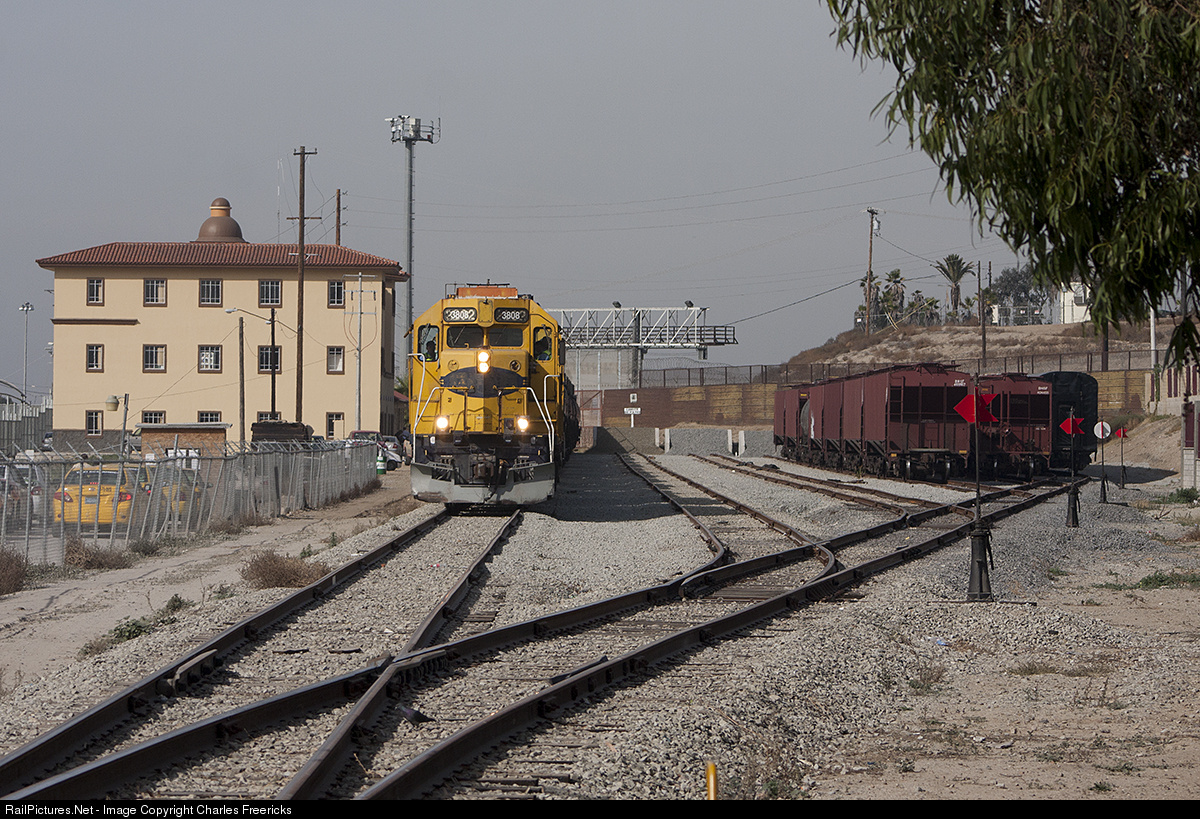 | The Baja California Railroad interchange job has just pulled back into Mexico from the USA and is being inspected by Federal Police on the other side before the train will be turned over to the road crew for the day's run to Valle Redondo. The building on the left is the new BJRR HQ and Tijuana station. |
