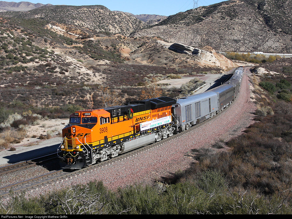 Brand new BNSF 3908 leads the 2015 Christmas Train up Cajon Pass as it enters Sullivan's Curve.