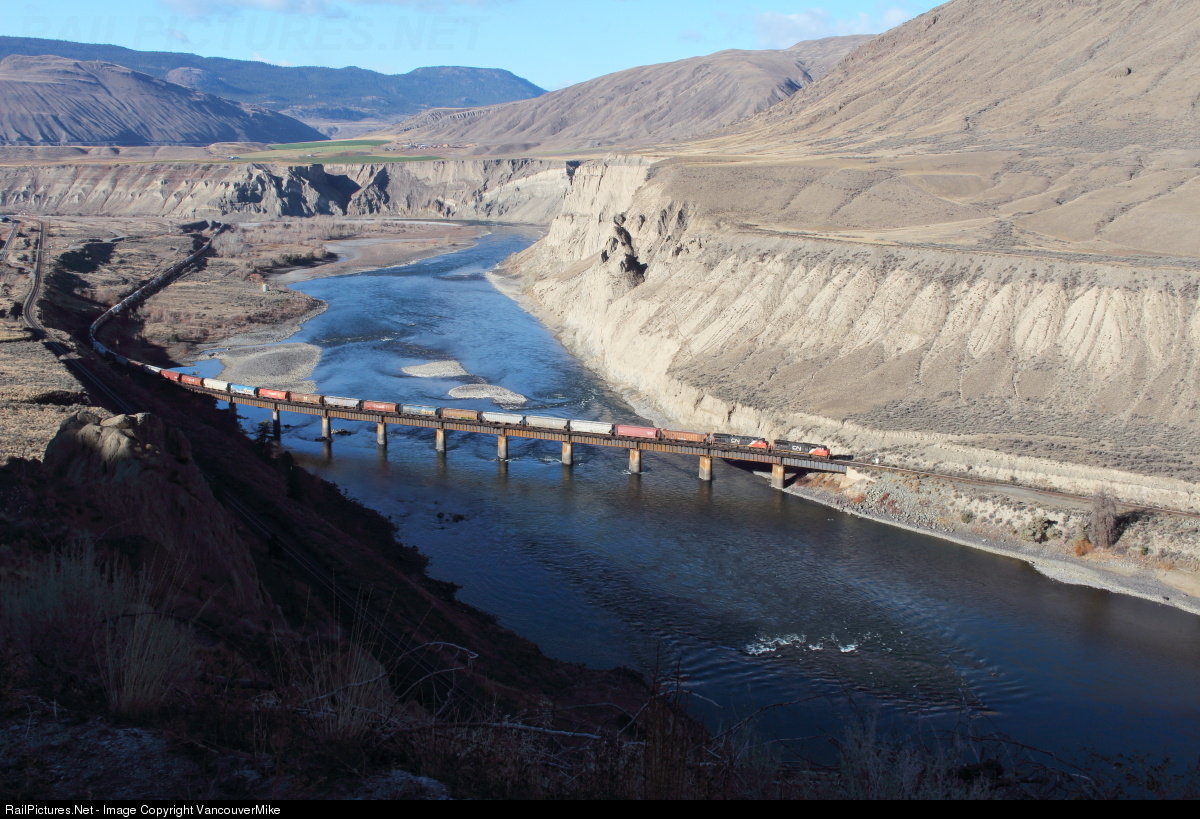 Eastbound unit grain train; heading over 2nd crossing east of the town of Ashcroft. Track in foreground is Canadian Pacific's and the Ashcroft Terminal is located top left.