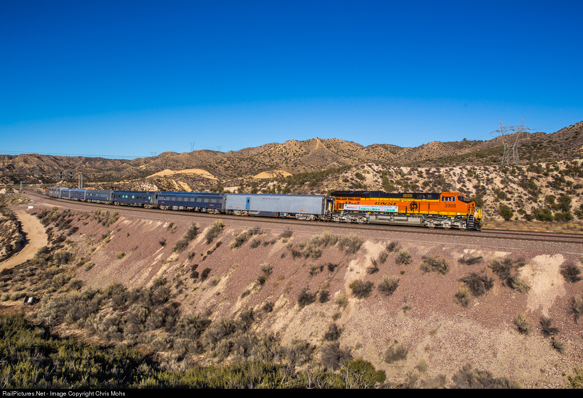 | The 2015 BNSF Christmas train with new Tier 4 compliant engines on each end. BNSF No. 3908, leads the train eastbound into Summit, where the train will then return westbound back to San Bernardino. |