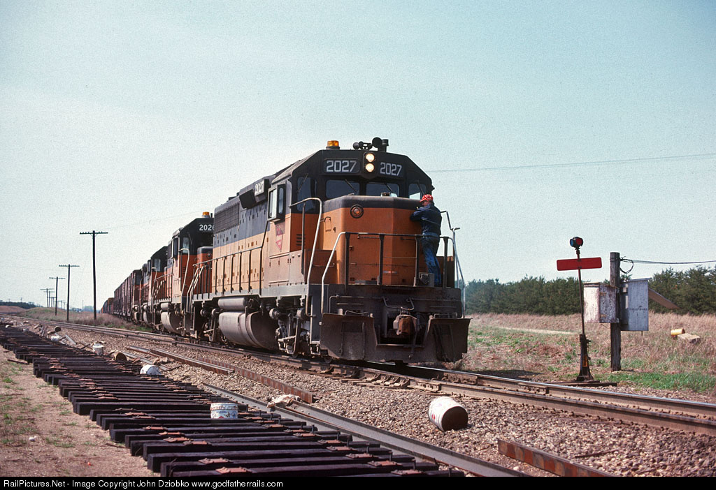 | The headman climbs onboard the northbound Milwaukee Road 2027 after lining the switch at Ebner Junction. The MILW ran on the BN from Ebner to Savanna. The BN has laid out ties to extend their own siding on the mainline. While the MILW track is gone today, the siding still sees daily use. |