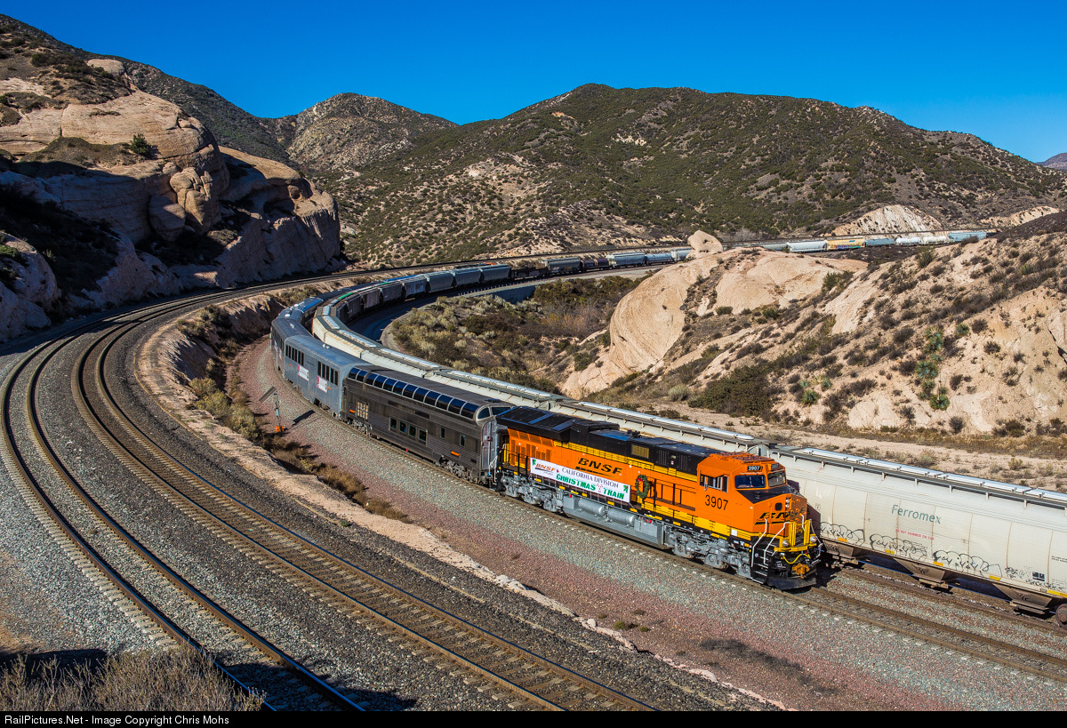 The 2015 BNSF Christmas train with new Tier 4 compliant engines on each end . BNSF No. 3907, rolling the Christmas train westbound down the hill, passes a Union Pacific train stopped on the hill for priority traffic.