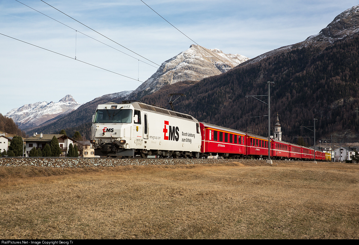 | Regio Express 1144 from St.Moritz to Chur near Bever, with Ge 4/4 III # 643 with publicity paint scheme for "EMS Chemie". On the rear of the train two freight cars with poastal containers (for parcels). |