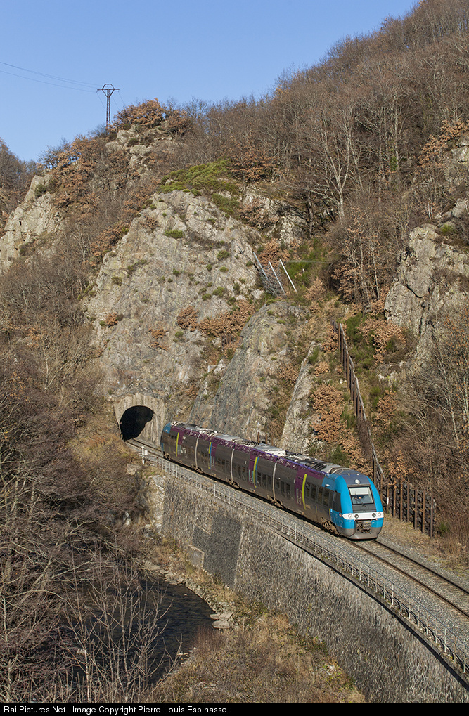 | The Intercity train from Clermont-Ferrand to Béziers runs the Alagnon valley, seen here exiting the tunnel of Vauclair. |