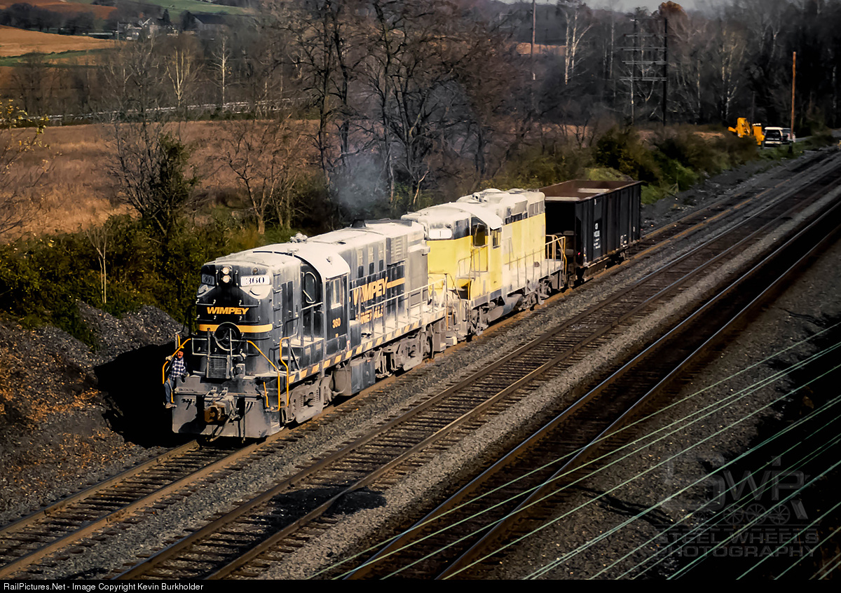 Built originally for the Duluth Winnipeg & Pacific Railway, Wimpey Minerals USA employed this Alco RS-11 for several years during the early 1990s to handle switching at the limestone quarry in Annville, Pennsylvania. WIMX 360 started life as DWP 3606 and then went to the Central Vermont as CV 3606; Quincy Terminal 3606 in 1985, to WW in 10/88; and finally to WIMX 360 in March of 1991. The WIMX GP9 #1 - ex-Broyhill and previously ex-C&O - was the previous mainstay for power prior to the arrival of the Alco.