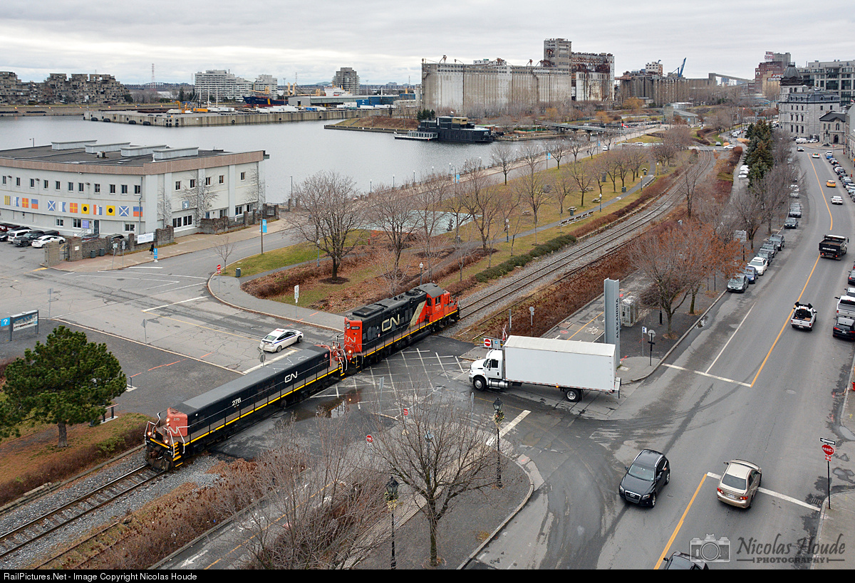 | CN YPCS01 rolls through the Old Port of Montreal with CN 276 & CN 7275 light to pick up 20 cars from the Port of Montreal. The CN Wharf Spur is limited to 10 mph, and crosses the Old Port of Montreal. The CN Pointe-Saint-Charles yard switcher goes to the Port of Montreal daily to interchange with it. |