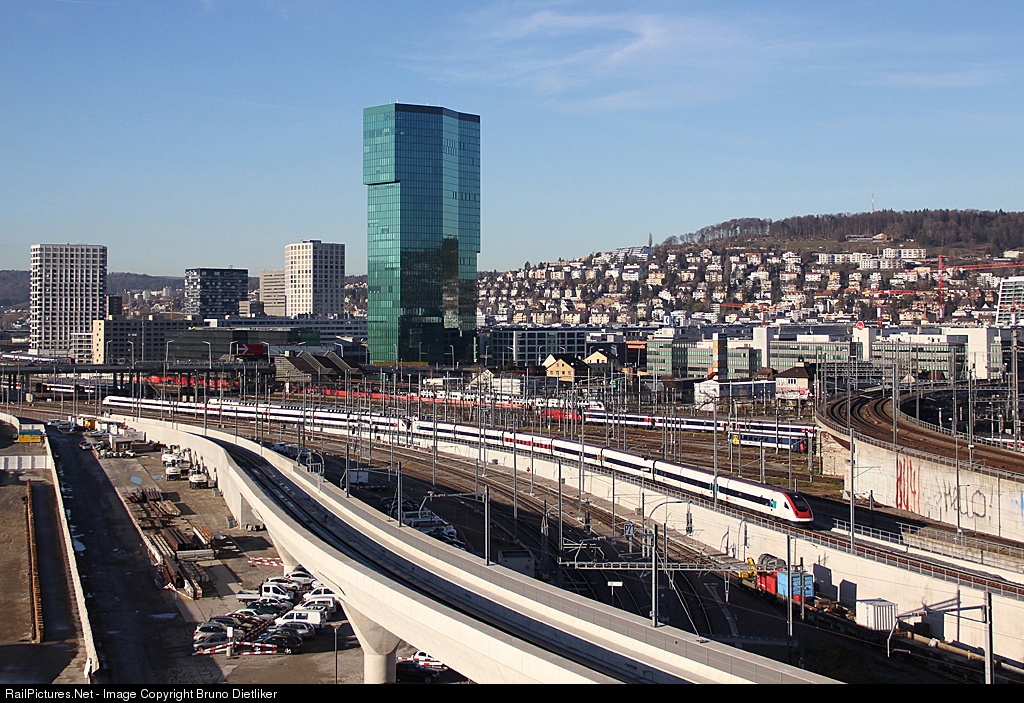 Double-ICN (InterCityNeigezug) from St. Gallen toward Lausanne leaves Zürich HB. Normally this train runs over the new bridge Kohlendreieckbrücke in the foreground. At this day there was a disturbance at the signal box, this ICN runs on the normal track for the opposite direction. The green building in the background is the highest in the city: Prime Tower, 126m high