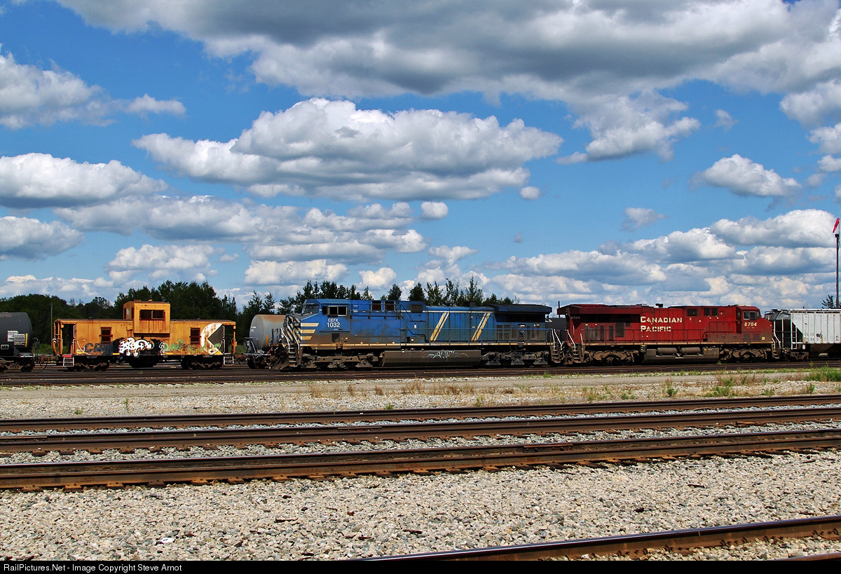 CEFX AC4400CW 1032 and CP ES44AC 8704 work at Smiths Falls Yard.