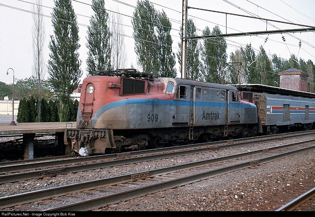 One of seven GG1s painted in Amtrak's "Platinum Mist" scheme, the 909 pauses briefly at Lancaster's 1929-built high-level platform with the westbound Broadway Limited. (The other six GG1s similarly painted were: 902, 905, 906, 924, 926, and 927.) Note the leaky steam connection under the front coupler. No. 909 was built in July, 1940 by Altoona/GE as the PRR No. 4908.