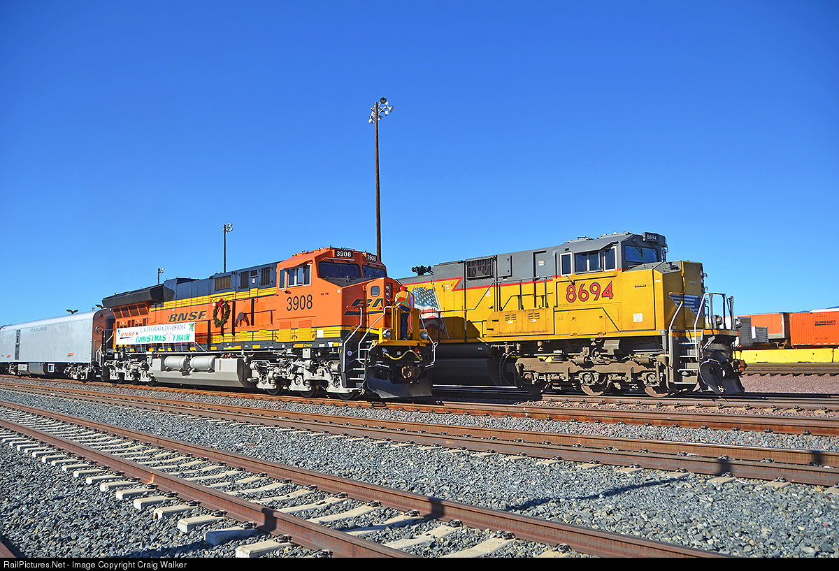 | While BNSF's 2015 California Division Christmas Train lays over between its two runs (both from San Bernardino to Summit, 25 miles away atop Cajon Pass), the crew and volunteers eat lunch - except for a few volunteers who eat quickly in order to grab a few shots from trackside before loading passengers for the afternoon trip! Passing on the adjacent mainline is a westbound Union Pacific freight, with SD70ACe 8694 as the rearmost DPU locomotive. (Note the BNSF crewman wearing a Santa hat on the front walkway.) |