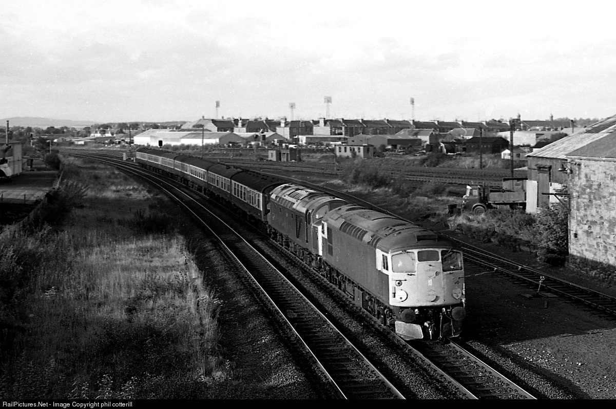 | 26034 has rescued a failed 40150 and arrives at Perth with a late running Inverness to Glasgow train in October 1980. |