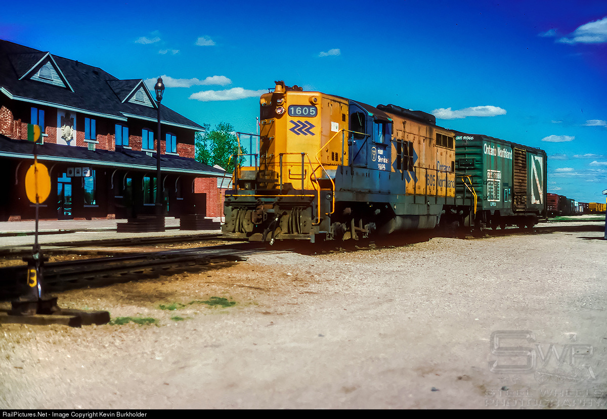 | Ontario Northland GP9 #1605 works a single 40-foot boxcar in Ontarion Northland scheme at the railroad's Cochrane Yard in northern Ontario on June 8, 1995. The car was being spotted at a freight house nearby for loading of goods to be taken to Moosonee later on a Little Bear train. |
