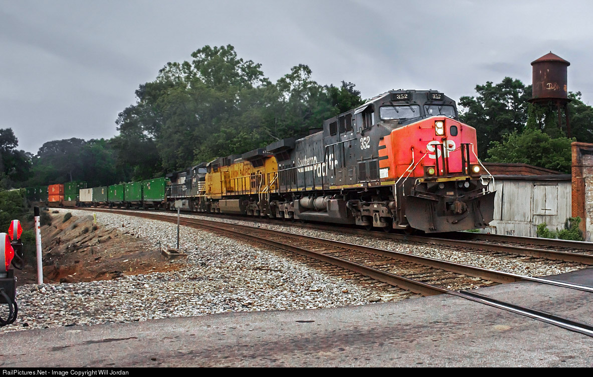 NS hot shot intermodal 213 hurries south through Seneca, SC with SP 352, one of only five unpatched former Southern Pacific units remaining on Union Pacific's roster, leading.