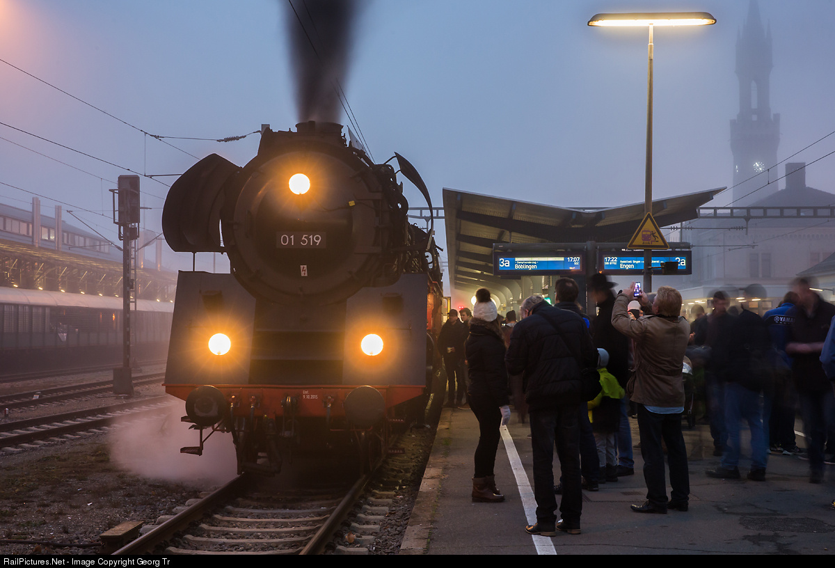 | 4-6-2 "Pacific" express train steamlocomotive 01 519 of association Eisenbahnfreunde Zollernbahn (EFZ) with a christmas market train in Konstanz, ready for the journey back to Böblingen. The locomotive was built by Henschel in 1936 as 01 186 and was reconstructed in 1964 by the Deutsche Reichsbahn of the German Democratic Republic (GDR) in Meiningen as 01 519. With EFZ since 1996 and operational again since a few weeks, again with a cone-shaped smoke box door. |