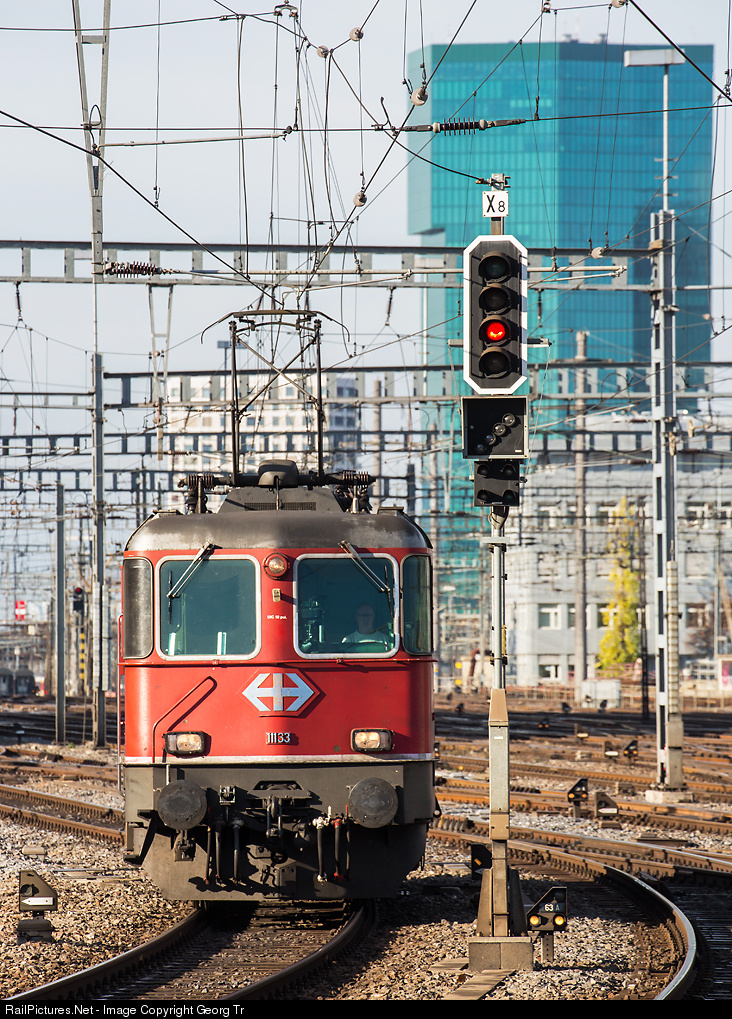 | Re 4/4 II # 11133 (built 1968) with large chromium SBB signet on the front, dating from the time when it was in the orange/light grey "Swiss Express" paint scheme (1975-1986). In the background the 126 meter high "Prime Tower", Zürich's highest building. |