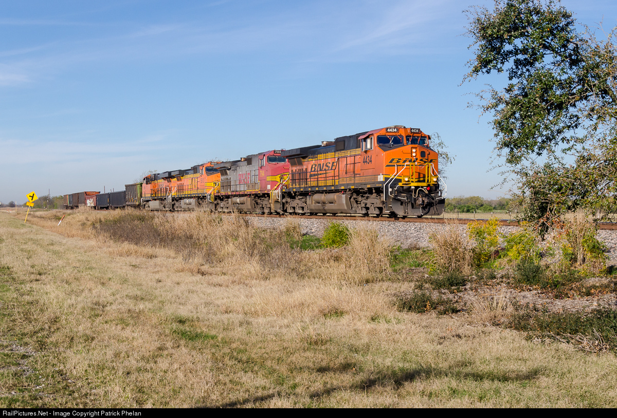 A repainted Dash 9 leads an eastbound trackage rights train from Eagle Pass, TX toward San Antonio with a favorable horsepower-ton ratio. The lead unit used to be a very rotten pumpkin, but looks good now, even with the non-standard orange window wipers.