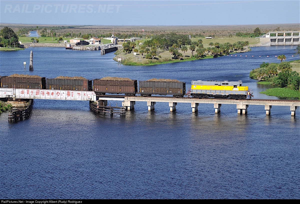 | After getting out and manually pushing a button to turn the swing bridge, the conductor rides on the front steps to once again get out and manually push a button to close it. In the background is the western portions of Lake Okeechobee, which is predominately covered with sawgrass. The eastern portion of the lake is polar opposite however, appearing as an ocean from atop the levees. |