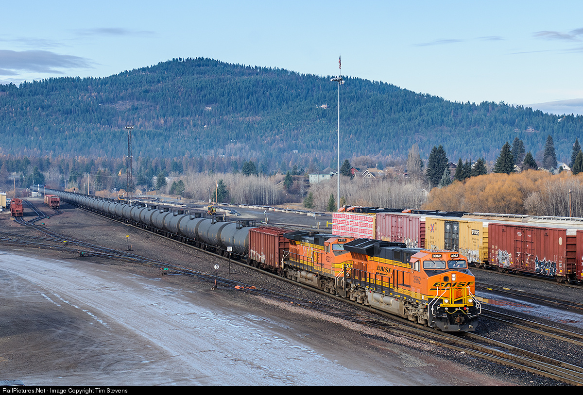 | Tacoma, WA - Epping, ND crude empties roll into Whitefish, MT for a crew change. New ES44C4 3962 leads the way. |