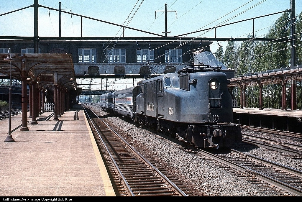 A 3-car Washington Section of the National Limited passes through Lancaster's station without stopping. The train was split in Harrisburg, and Lancaster was served by the New York Section, Train 30. No. 925 was built by Altoona/GE in March, 1943 as the PRR No. 4932.