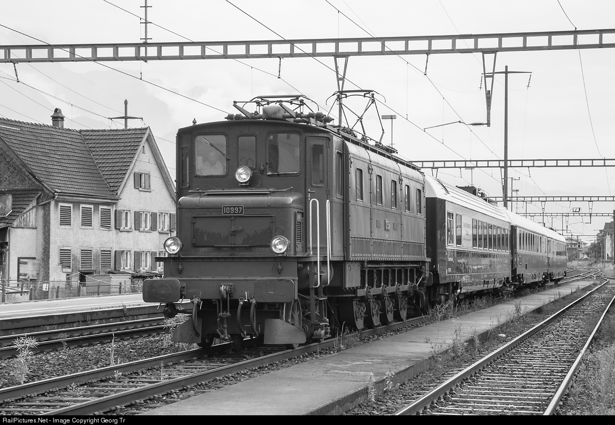 | Ae 4/7 # 10997 of association Swisstrain with 3 Prestige Continental Express (PCE) dining cars entering Mels for a short service stop. The express train locomotive was built in 1933 by SLM and MFO for the SBB. |