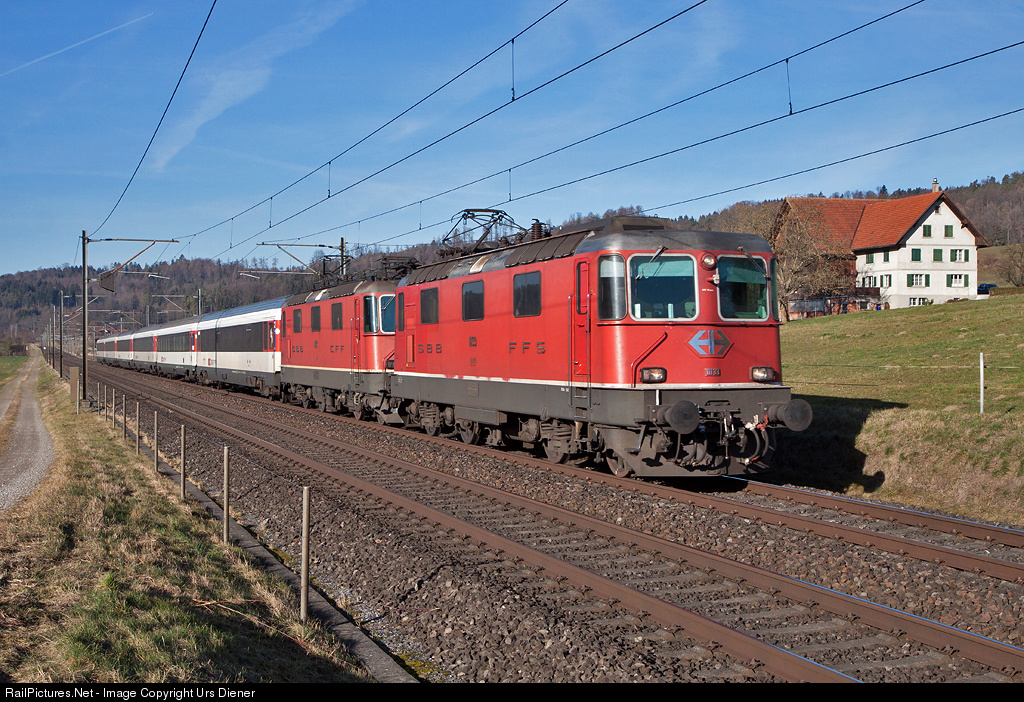 | The former Swiss Express Re 4/4 II 11133, which has still the large SBB symbol on the front, and the sister locomotive 11244 are pulling IR 2265 from Basel to St. Gallen.