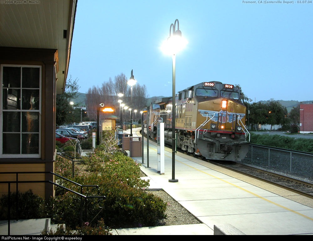 | Just after sunset, the UP5800 holds for a clear signal at the Amtrak California Centerville station in Fremont, CA. |