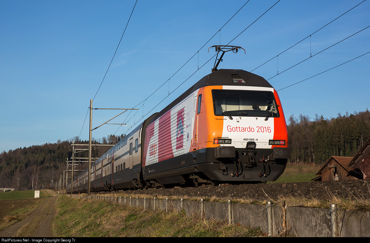 | Re 460 # 085 with "Coop/Gottardo2016" publicity paint scheme, pushing Intercity 714 St.Gallen-Geneva Airport between Elgg and Schottikon. The Coop supermarket chain is one of the sponsors of the opening event for the Gotthard base tunnel (GBT) in summer 2016. |