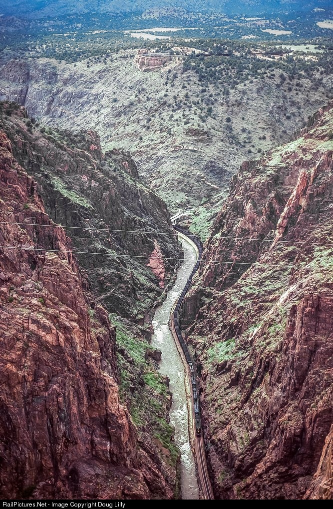 Arguably the most scenic location along the Scenic Line of the World, the Royal Gorge commanded a good portion of Rio Grande publicity, including the slogan ”Royal Gorge Route”, and a passenger train named for the Grand Canyon of the Arkansas. Seen here from the suspension bridge that span the gorge some 1000 feet above the river and the railroad, eastbound D&RGW coal train 788 threads its way through the narrow canyon. Leading the train is a D&RGW tunnel motor, followed by four SD40/SD40-2’s, three from the MP and one from the UP.