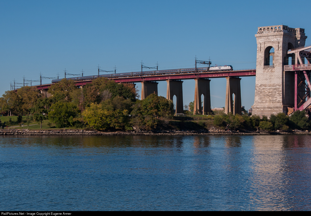 | Amtrak Northeast Regional # 163 on its way from Boston to Washington DC, on the western approach to the Hell Gate bridge on a beautiful early Fall afternoon. |