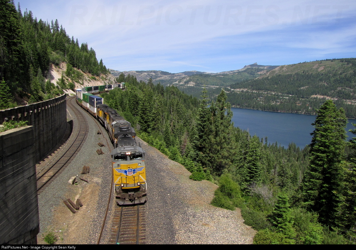 | Goooooood morning Donner! A short Z train eases down the east slope of Donner Pass, seconds from entering one of the parallel tunnels at Andover. Beautiful Donner Lake lies in the valley below, while the summit of the Sierra Nevada stands in the distance. |