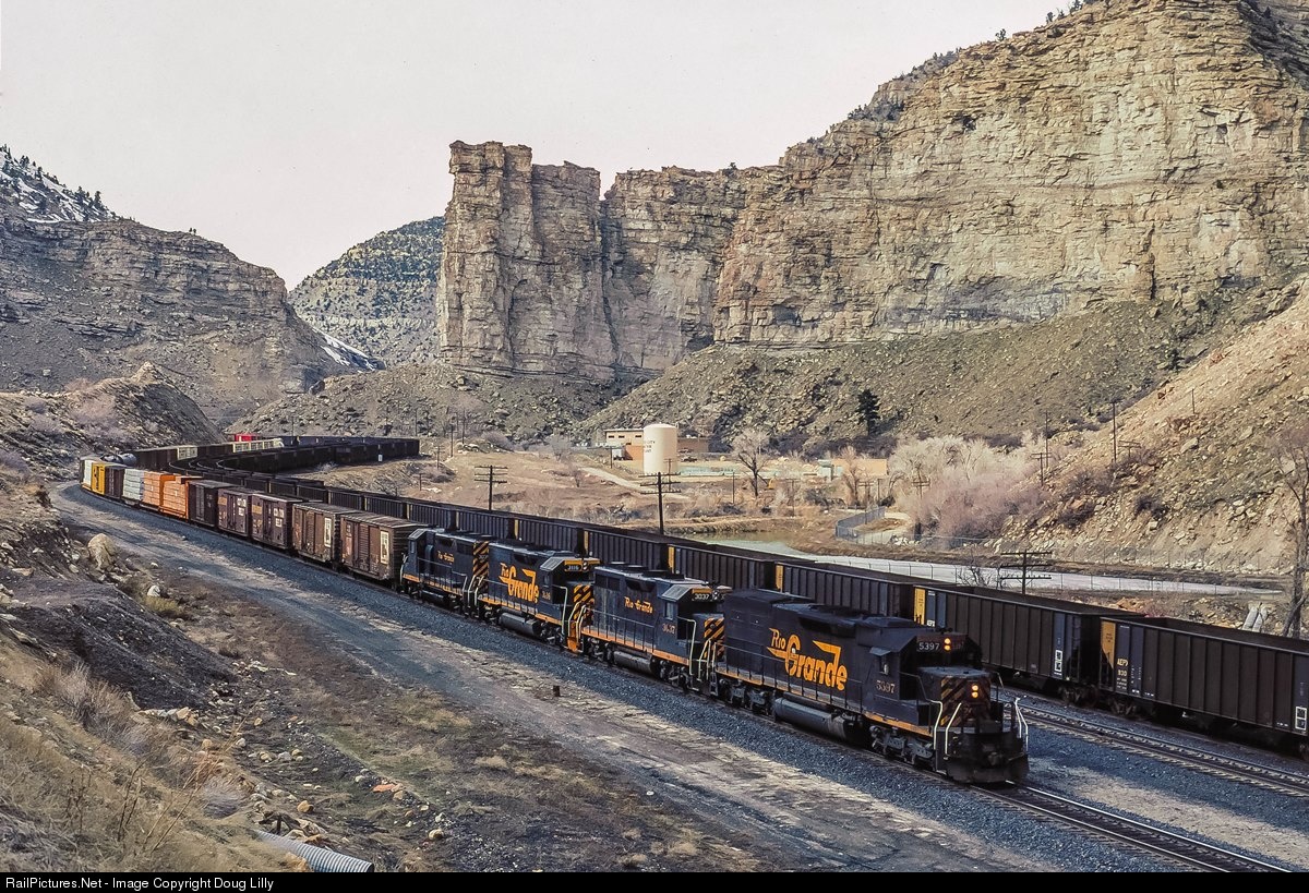 | An eastbound Rio Grande manifest, led by an SD40T-2/GP35/GP40-2/GP35 power combo, winds through Castle Gate, Utah. |