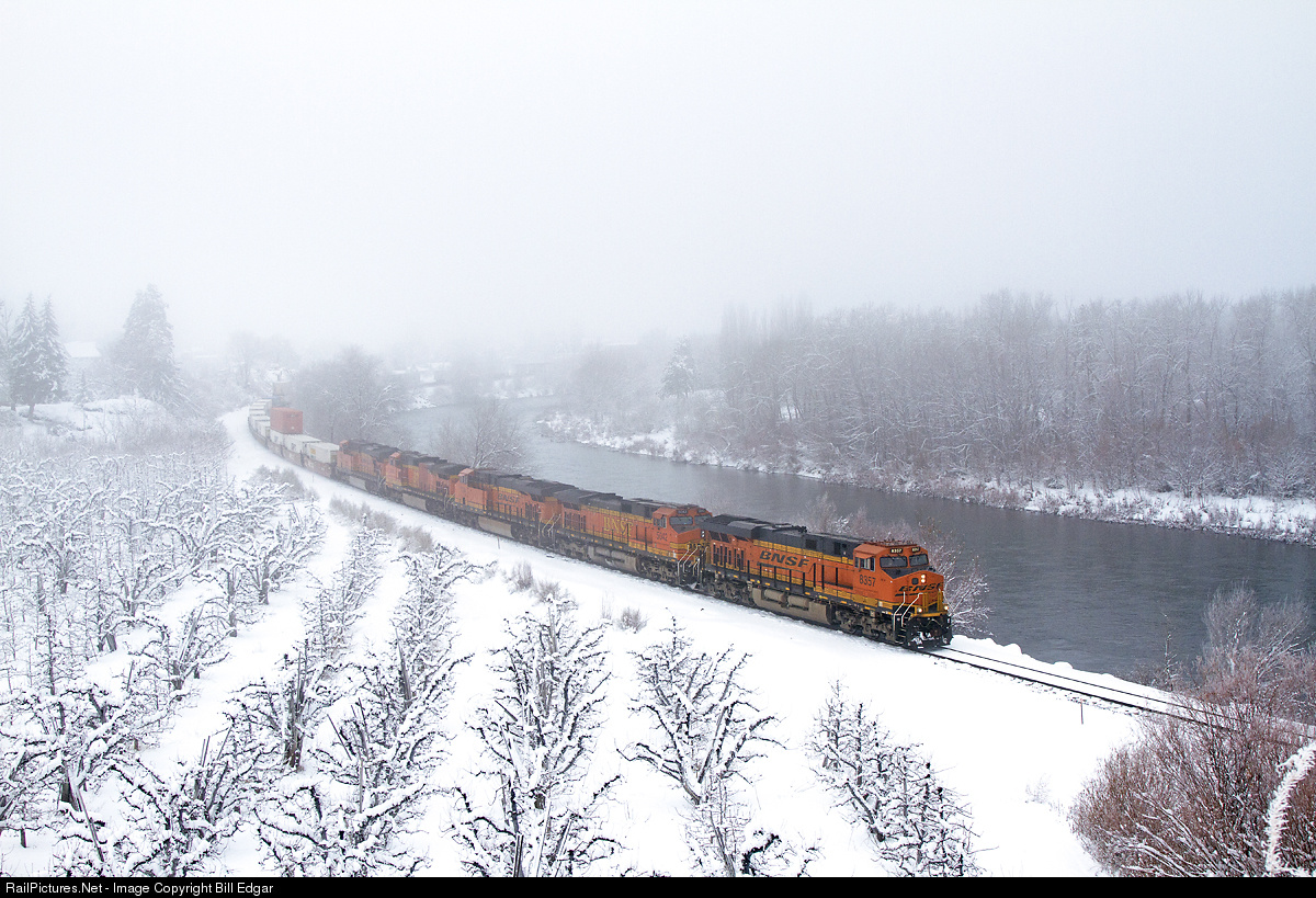 | BNSF 8357 leads an eastbound Z train around Monitor curve about five miles west of Wenatchee, Washington in snowy, foggy conditions as storms piled feet of snow on the Cascade Mountains before and during the Christmas holiday. Quite a change from the nearly snowless winter a year ago. |
