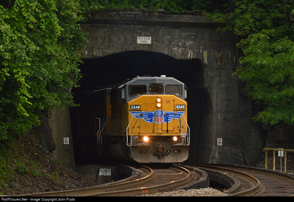 | A pair of Union Pacific EMD's lead a loaded ethanol train out of West Vivian Tunnel as they climb east towards a crew change in Bluefield. This train would eventually stall at a location up the line called Switchback and a helper set was brought to couple onto the head end and pull the train to Bluefield. |