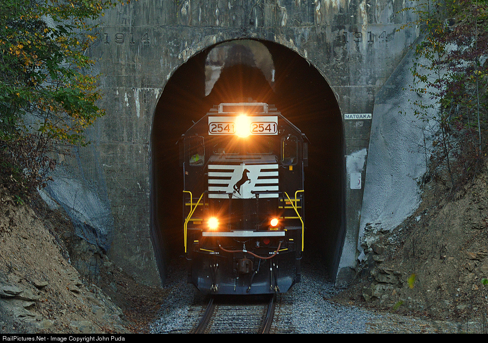 | A standard cab SD70 leads a loaded coal train downgrade as it heads east out of Matoaka tunnel on the former Virginian. In the coming weeks scenes like this will become a thing of the past as Norfolk Southern will mothball the line between Elmore and Princeton effective Oct 1st. |