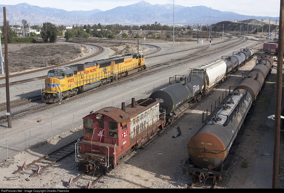 | Power for the Kaiser Hauler heads east out of West Colton on a super clear afternoon in which San Gorgonio Mountain can actually be seen in all of its glory. In the foreground is the GATX facility with some OOS rolling stock and power. |