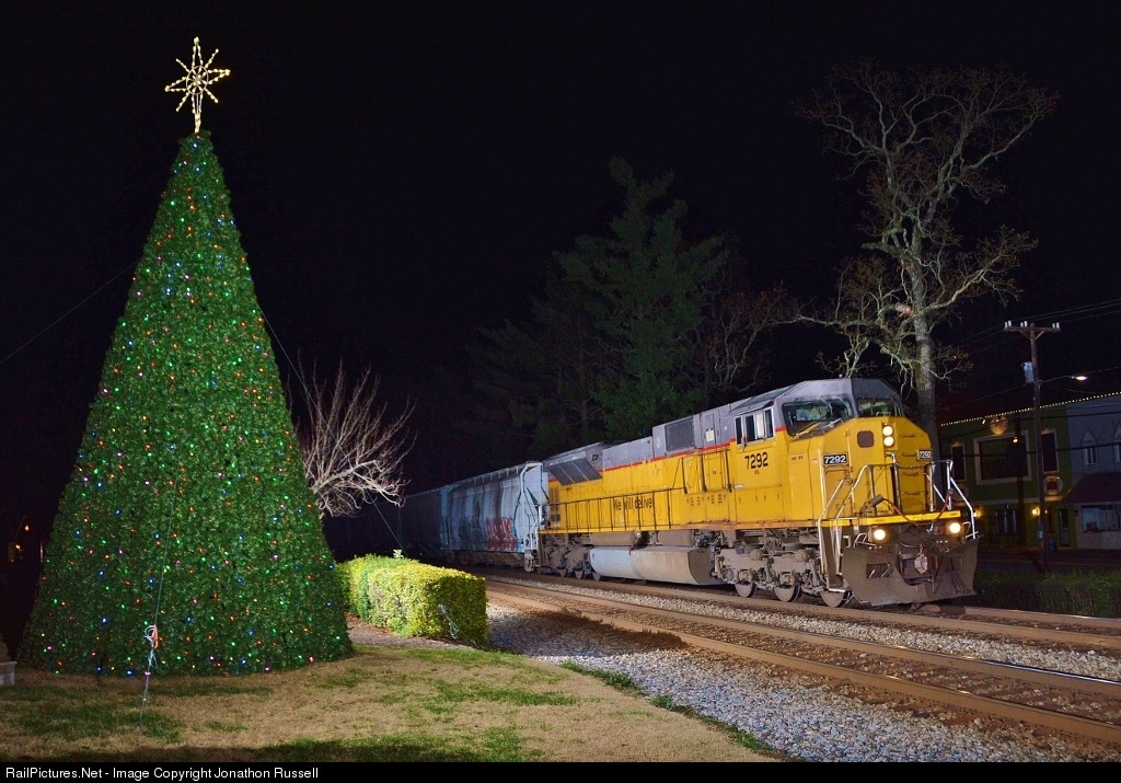 NS 349 heading south through Thomasville with a lone ex-UP SD90MAC in charge passing the towns Christmas tree.