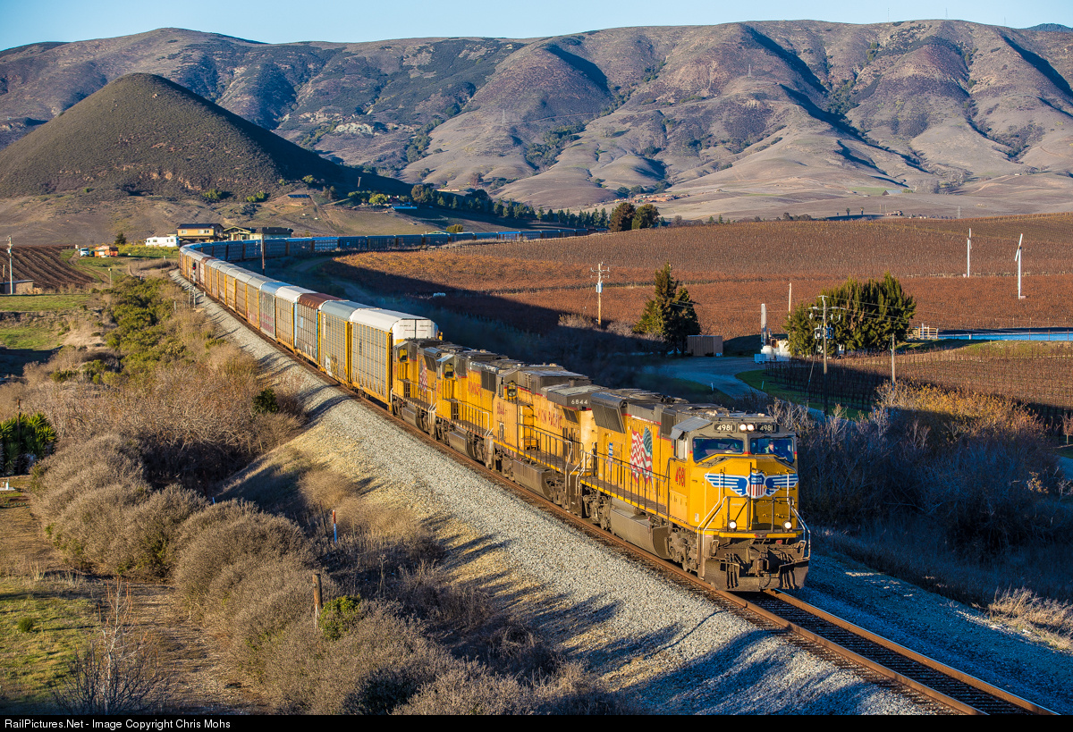 Heading southbound in the late afternoon sun, Auto Racks behind Union Pacific 4981, head through the wine growing region of San Luis Obispo California.