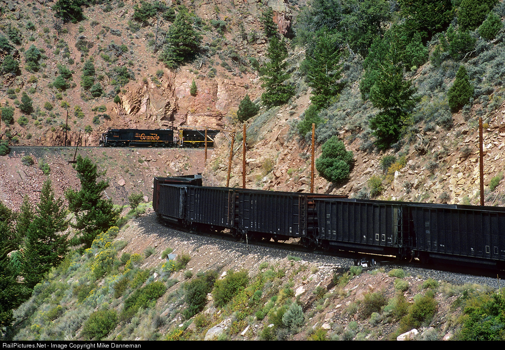 With the latter half of the empty coal train rolling by in the foreground, the head end pops out from behind a cliff on the other side of the canyon on September 8, 1992. This rugged piece of track is between Crater and Volcano, Colorado, on Rio Grande’s Craig Branch, and illustrates the tight loop of track negotiated within Rock Creek Canyon.