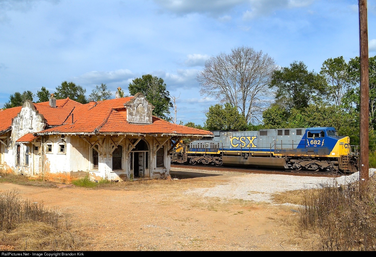 | Running south with its horses roaring, this behemoth CSX No. 682 passes the Wadley Railroad Depot which is one of only four surviving Mission Revival Style train stations in Alabama. Built in 1907, the Spanish-style depot looks very unique compared to other buildings in the small town of Wadley. Amazingly after all these years, the clay tile hipped roof is almost fully intact with only a small amount of tiles missing. |