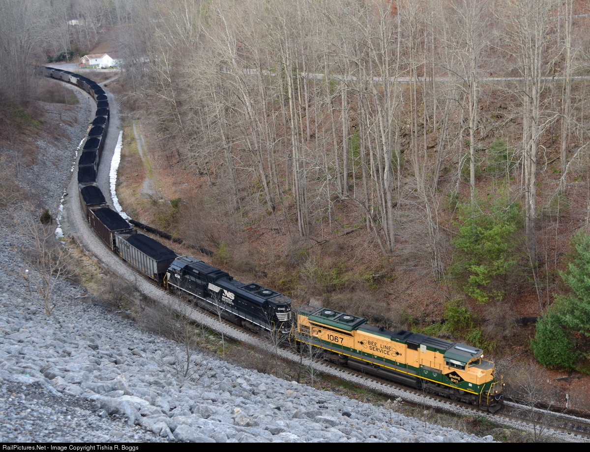 | With NS 1067 Reading Bee Lines heritage locomotive leading the way, eastbound coal loads bound for export crawl upgrade through Banner, Virginia just before entering the western portal of Little Tom Tunnel along Norfolk Southern's Lower Clinch Valley District of the Pocahontas Division. |