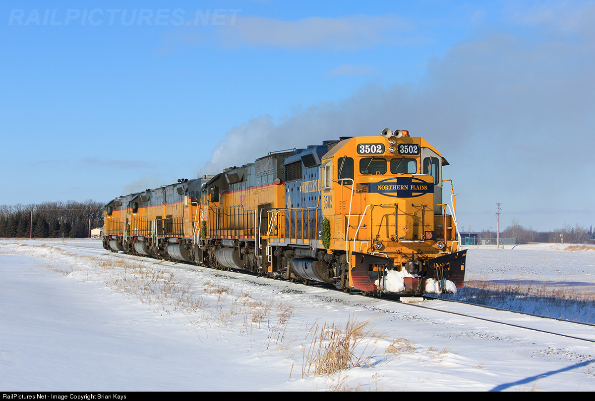 NPR 3502 and a four pack of former UP tunnel motors wait for CP 299 to clear the Thief River Falls yard before entering and retrieving empty grain hoppers for the elevators along the Wheat Line in North Dakota.