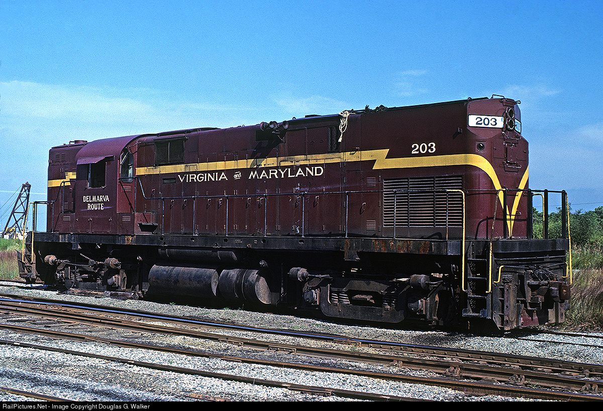 A railroad down the Delmarva Peninsula - from Wilmington, Delaware to Cape Charles, Virginia - was completed by Pennsylvania Railroad subsidiary New York, Philadelphia & Norfolk in 1884. This line, coupled with car ferry service across the mouth of Chesapeake Bay to Norfolk, VA, offered a bypass to the congestion and restrictive freight clearances of Baltimore, MD, and Washington, DC. In the late 1960s the line suffered due to Penn Central's neglect. On April 1st, 1977, the Virginia & Maryland Railroad took over operations from Conrail, operating the line between Pocomoke City, MD, and Cape Charles, and extensive track renovation was undertaken. At the end of October 1981, the Eastern Shore Railroad took over from the VAMD. On October 2nd, 1982, Alco C420 203, built in March 1964 as Long Island 210, was photographed still wearing predecessor VAMD colors at Virginia Beach, Virginia.