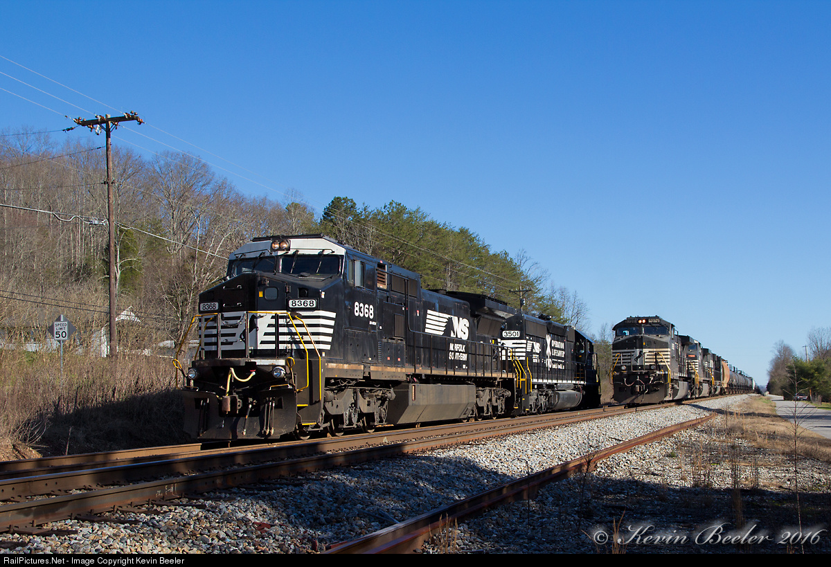 In a very unusual move, a pair of helper units were used to push NS 27V from Chestnut Ridge all the way to Harriman Junction. Those helper units have uncoupled from 27V, and are now running back (under symbol T76) to Mullen Ridge to help another train, this time 111. They have just made it back to Blair, where 115 has been waiting for them to clear the single track Main, so they can proceed. Helper set consisted of an ex-Conrail Dash 8, and an nice looking OLS SD40-2.