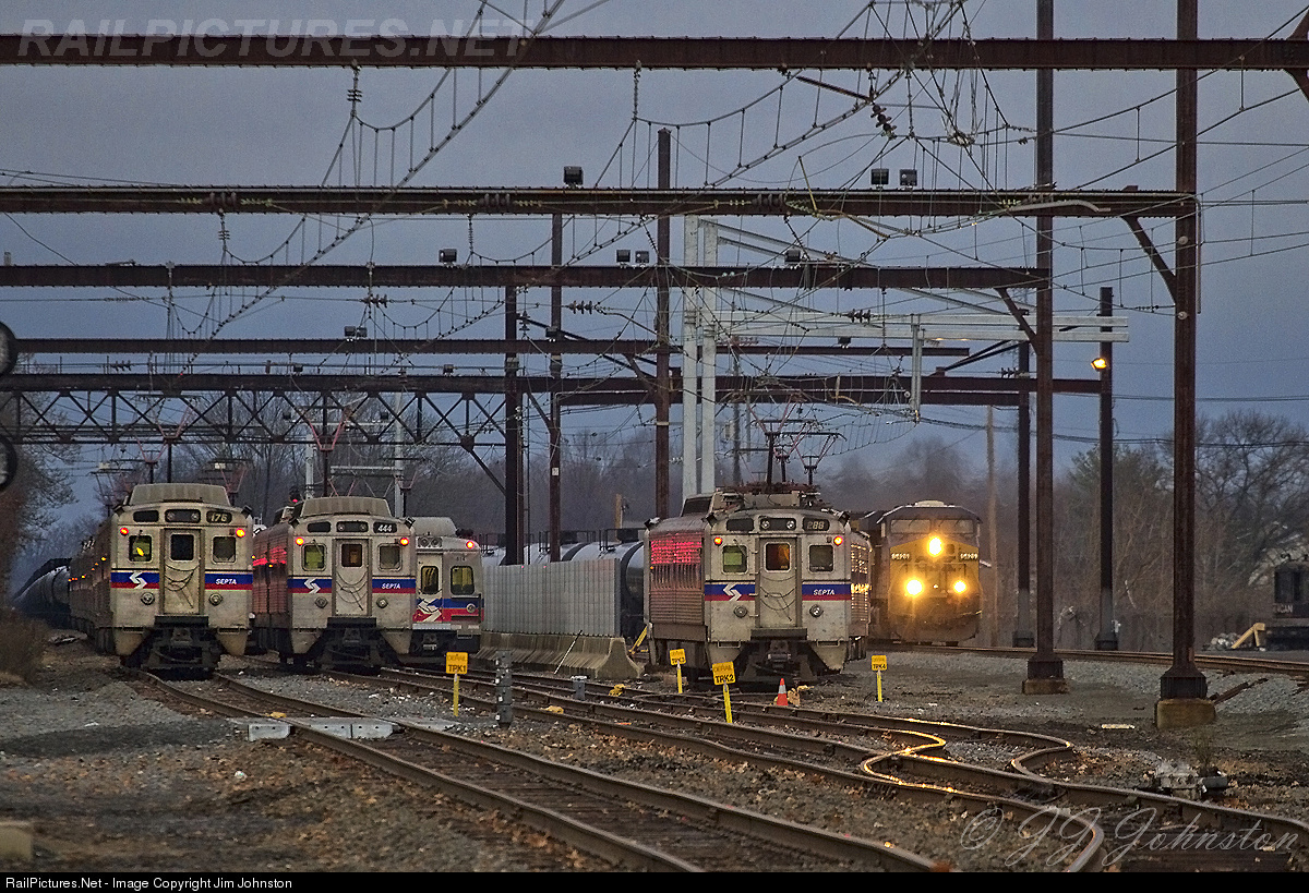 CSX K138 load oil train bound for Philadelphia passes the small SEPTA yard at dusk.