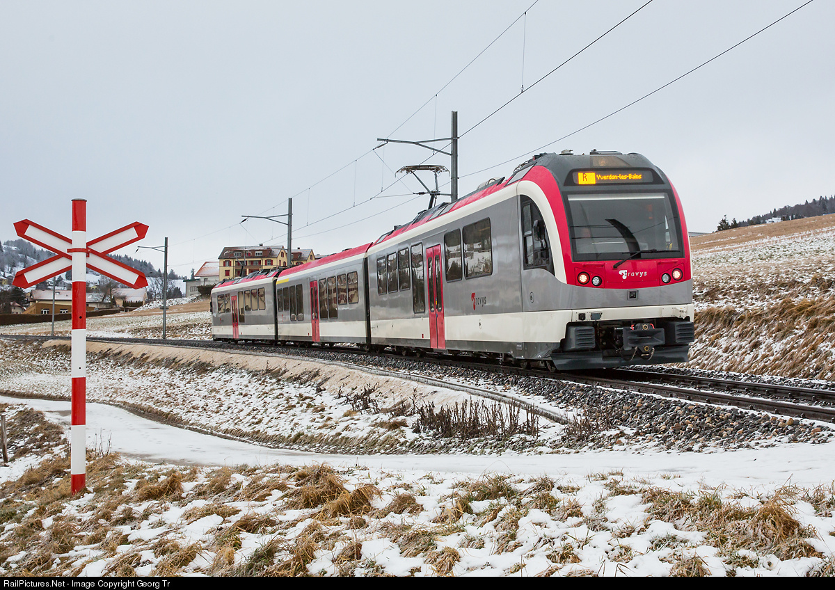 | Travys gets 3 new trains from Stadler Rail for the line Yverdon-Ste-Croix, one is delivered already and in service. Be 4/4 # 3001, car AB # 3031 and Be 4/4 # 3002 near Ste-Croix on the way down to Yverdon. |
