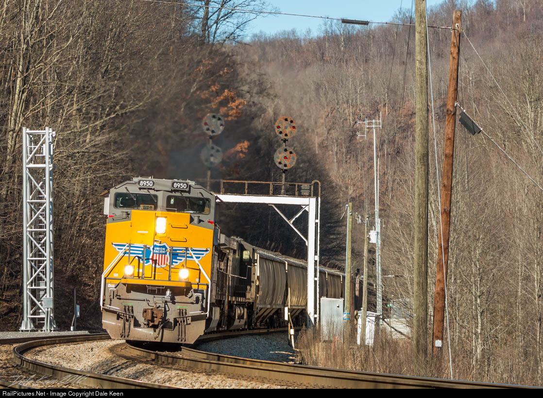 | A UP SD70AH leads unit grain train 44G up the Elkhorn Grade just west of the tunnel that bears the same name. Here we see the train under the classic N&W CPLs at Maybeury. Not the mast that has been installed to the left, and indication that these signals are serving in their last days. |