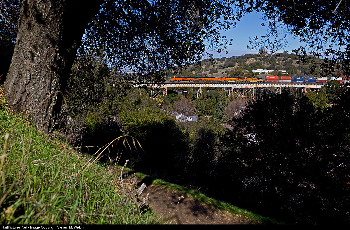 | Four big GE's hustle a Logistics Park, IL to Oakland, CA intermodal train over the 80-foot tall and 1680-foot long Muir Trestle on a beautiful New Years Day. |